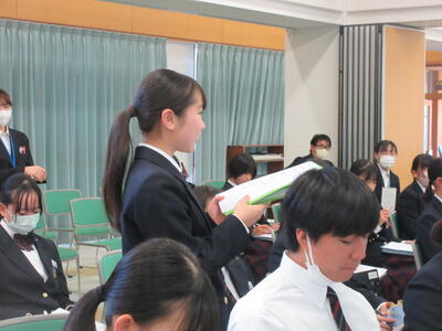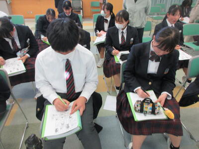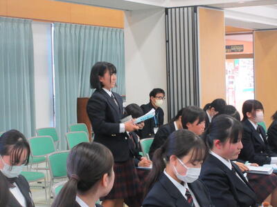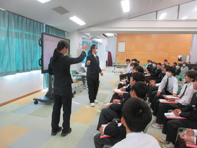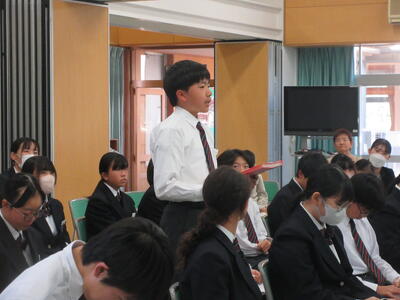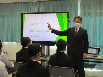 今回の人権教室をとおして、固定観念(ステレオタイプ)が偏見、差別につながりやすいこと。また、私たちは固定観念に陥りやすいという自覚をもつこと。インターネット上のいじめや個人情報の拡散は重大な人権侵害であること。被害者にも加害者にもならないために、①SNSに個人情報がわかる写真などをアップしない。②自分がされていやなことはSNS上でもしない。③一人で悩まず、保護者や学校の先生に相談する。 以上のことを全校生徒で考えました。