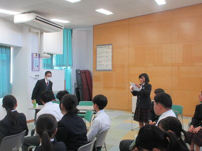 3時間目の1年生は香取学習3。将来の職業として関心のあるものについて調べ、レポートにまとめています。3年生は英語。ALTの先生からThanksgiving Day(感謝祭)についてお話を聞き、理解を深めました。