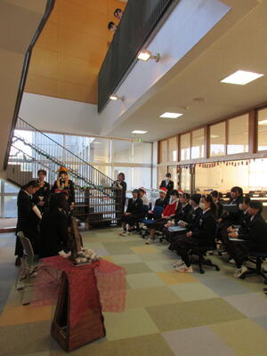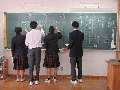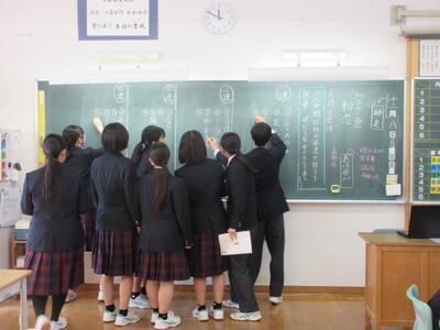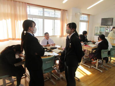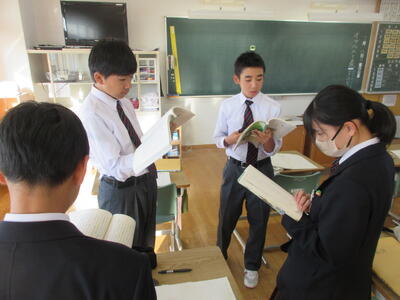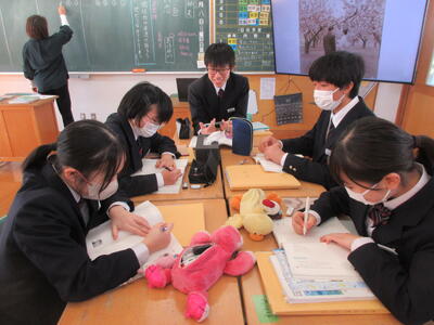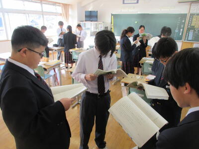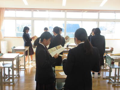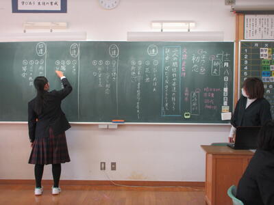 一方、6時間目の2年生は国語。教育実習の先生の精錬授業。教育実習の総まとめです。平家物語から「敦盛の最期」について古文を読み解き、登場人物の心の変化を考えました。平安時代末期から鎌倉時代に生きた年齢の近い敦盛の思いと今を生きる中学生。時代も背景も全く異なりますが、同じ世代として生きる若者という点では同じ。敦盛と自身をつなげていくと、どんなことが考えらるのか。横笛を吹く雅な青年敦盛と雅楽を学んでいる香取中生にはどこか共通点も見つけられそう。何かと何かを関連付けていくと、「つながり」がみつけられるかもしれません。そんな視点に立つと古典の作品が現代に生きてくるような思いますがいかがでしょうか?