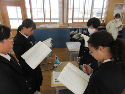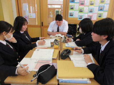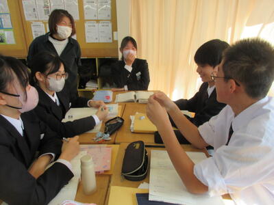 そして、3年生の6時間目は英語。ALTの先生との授業。太平洋ゴミベルト(大量のプラスチックごみがまるで島のように漂っている地帯)についての記事を読みました。授業では海外からの観光客に向けてプラスチックごみのポイ捨て禁止を呼ぼかける看板(魚が訴える吹き出し)に自分だったらどんな言葉を書くかグループごとに考えました。遠い太平洋上の環境問題に感じるかもしれませんが、そのゴミは実は私たちが廃棄しているごみとつながっているかもしれません。そう関連付けてくと、太平洋上の環境問題が身近な私たちの問題となってきます。海洋上の魚たちが食べてしまっているマイクロプラスチックが、私たちの食卓につながっているかもしれないからです。