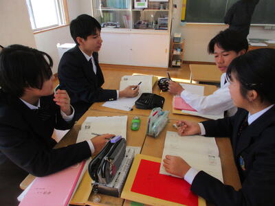 12月3日(水)みなさんお元気ですか。曇り空の一日でした。今日は3時間目に香取市教育委員会からお客様をお迎えして、1年生の英語と2年生の数学の授業を見ていただきました。1年生は「今していること」について相手にたずねる表現、Are you 〇〇ing ~?を何度も口に出して覚え、実際にペアになりジェスチャゲームをとおしてリアルな場面で「使う」経験をしました。英語を使って覚えるもの、ぜひスリランカから来た友達に現在進行形を使ってコミュニケーションをとってみるのもいいですね。2年生は三角形の合同条件について学びました。