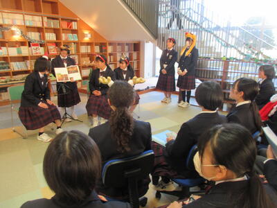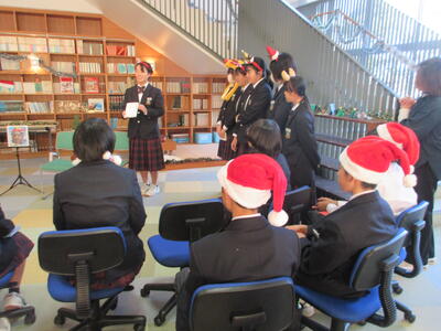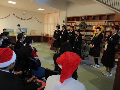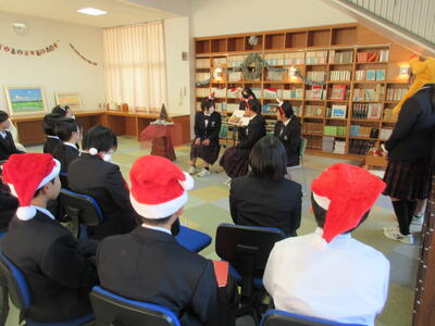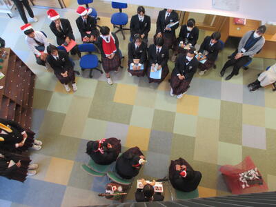 12月2日、今日の部活動から「文化部」について紹介します。季節は冬。緑と赤、金色や銀色が似合う季節となりました。今日の文化部のみなさんは図書室1階の閲覧スペースを季節に合わせた飾り付けを行いました。階段を降りると天井までの書棚に印象的なライトが趣ある空間を生み出す閲覧スペース。そこにリースやモール、小物で飾り付けをしました。明日も引き続き活動を行い、素敵な空間をつくりあげる予定です。今週末にはその会場で図書委員会のみなさんがイベントを行う予定です。お楽しみに!