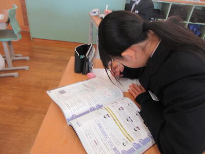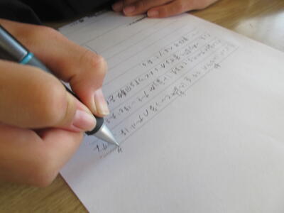 今回は、先生が「聴写」する文章(すでに授業で学んだ箇所)を一度読みました。聴写する文章を聞いて確認した上で、先生が2度読み上げ、生徒の皆さんはその文章をノートに写しました。一度目はひらがなでも構わないので書くことに集中。2度目は一度書いた文章を聞きながら確認し、修正したり、ひらがなを漢字に直したりしました。