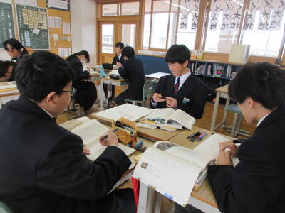 各グループでは、修復記録の蓄積とは何か? 世代を超えた技術の伝承とは何か?など話し合いをしました。「蓄積って何だろう?」「伝承とは?」など、問いに出された「言葉」に注目しながら教科書を精読する1年生のみなさん。話し合いの終わりに、あるグループからは「今日はじっくり議論できた。」「一人じゃこんなに考えられなかった」などつぶやきが聞こえました。扱った文章のタイトル『言葉がつなぐ~』に沿って、グループ内の生徒同士で「言葉をつないで」考えられた時間。とても素敵な1年生の姿を見ることができました!
