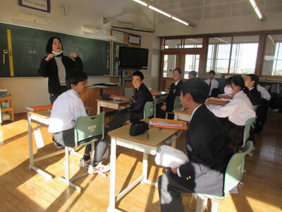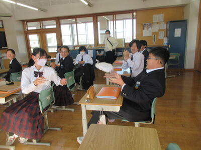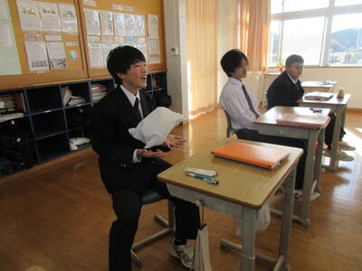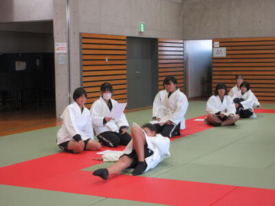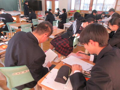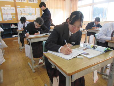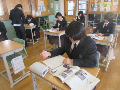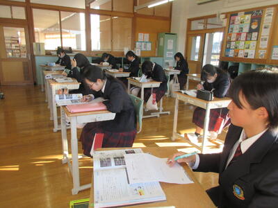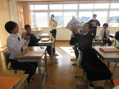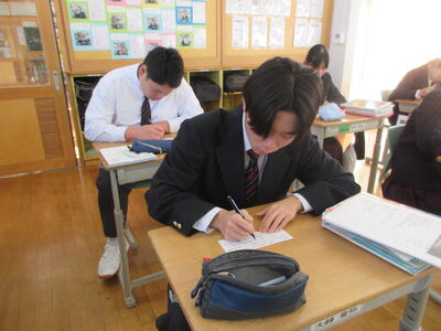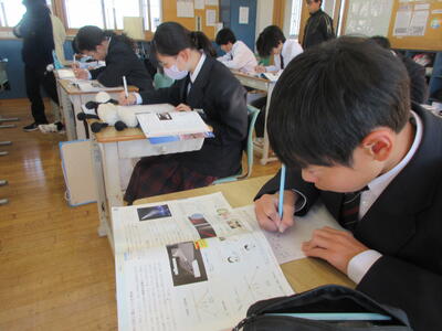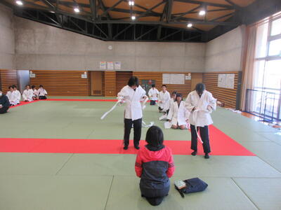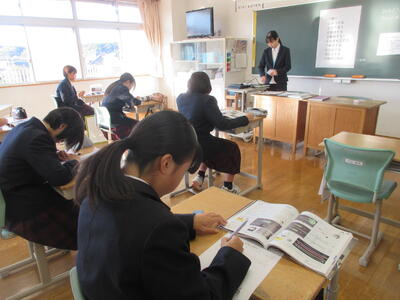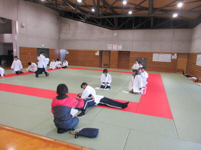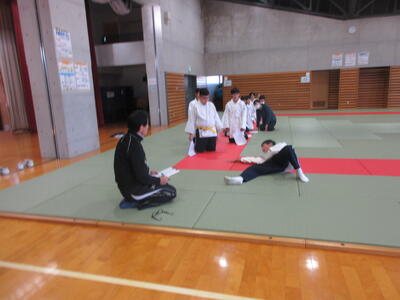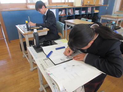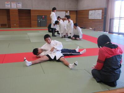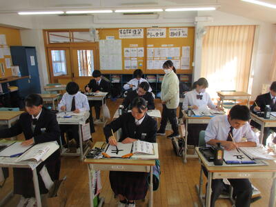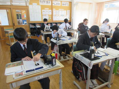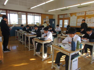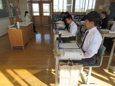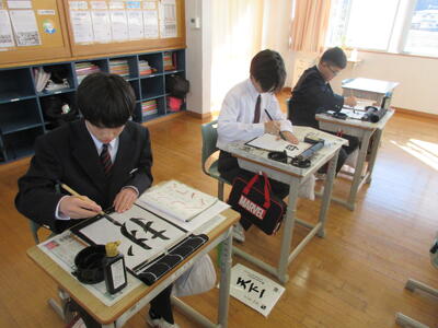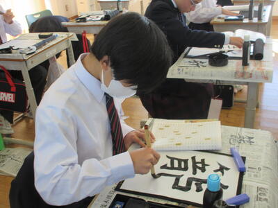 2時間目の1年生は国語。書写の時間。今回は書写をする際の姿勢を確認した後、半紙に今年の漢字をそれぞれが筆と墨で書きました。その漢字は「新」や「楽」、「挑」や「夢」などさまざまでした。ホームページを見ていらっしゃるみなさんにとってのこの1年、どんな漢字1文字になるでしょうか。続いて4時間目の1年生は英語。ALTの先生との授業。授業冒頭に既習文法事項の復習を兼ねて、Hot Potato Talk Relayを行いました。バトン替わりに熱いジャガイモ(実際は違いますが)を順番に回しながら、ALTの先生の質問にそれぞれが答え、次の人へつないでいきました。言葉は使って覚えるもの。それも会話のやりとりで覚えていくと忘れませんね。そして、6時間目は1,2年合同体育。今日は柔道のテスト。受け身等の技の各種と柔道着の帯の締め方などをテスト。みなさん真剣にテストに臨んでいました。