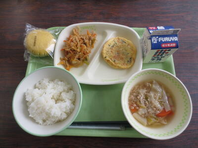 今日の給食はかに玉風塩あんかけにごはん、ワンタンスープに豚キムチ炒め、牛乳に蒸しケーキ。今日もおいしくいただきました。