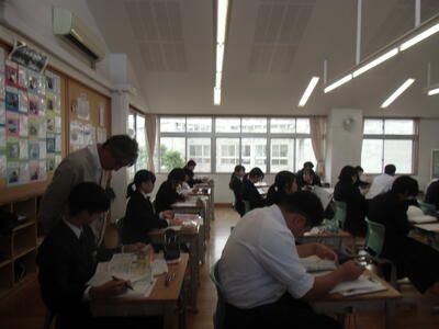 さて、今日の香取中。3年生は国語。紀行文 松尾芭蕉のおくのほそ道を自由進度学習で学んでいます。今日は個人やグループで、「月日は百代の過客にして、行き交ふ年もまた旅人なり。」で始まる序文と立石寺(りゅうしゃくじ)、平泉の部分を音読や暗唱を行い、内容理解に努めました。立石寺で詠んだ句は「閑かさや 岩にしみ入る 蝉の声」。平泉では「夏草や 兵どものが 夢の跡」でした。