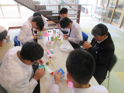 お昼休みは昨日の続きで多くの1年生が図書室1階スペースに集まり、牛乳パックアートを楽しみました。おしゃべりしながら楽しい時間が過ぎました。