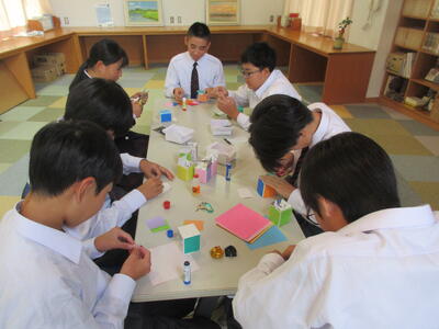 10月28日(火)のお昼休みに、図書室1階閲覧スペースでアートワークショップ第3弾を行いました。今回は牛乳パックを折り紙でデコレーション。1,2年生昇降口の階段が殺風景なため、生徒のみなさんの手作り作品で飾られたらと思いワークショップを開催。牛乳パックの側面を好きな色の折り紙で貼付け、その後は参加した生徒のみなさんの感性に委ねた飾りをつけて完成します。明日も引き続きお昼休みに開催予定です。