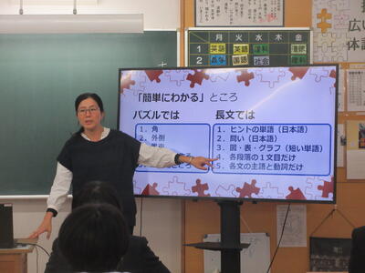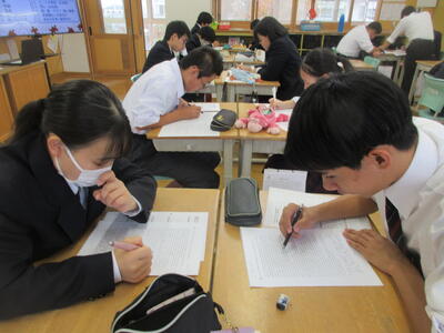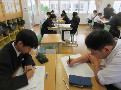放課後、3年生は補習、今日は英語。長文問題の攻略方法をみんなで考えました。担当の先生からは、全文を読まなくても、段落毎の冒頭1文だけでもおおまかな内容がつかめること、注釈に載っている単語が文章全体を考える大きなヒントになること、そして一文一文には必ず主語と動詞があること。動詞をつかめばその前後を読みながら意味がわかることなど、たくさんの攻略法を教えてもらいました。まずはちょっとずつ読む機会を作って、英文に慣れていくことが大切です。自分の好きな分野や推しのことなどを英語で読んだり発信できたら、今より自分の世界が広がるかもしれませんね。