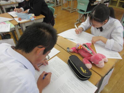 4時間目の3年英は家庭科。手で縫い、ミシンをかけパペットを作っています。完成したパペットはクリーナーとして活用できたり、パペット芝居として演じたりもできます。ショートストーリーをつくって発表予定です。