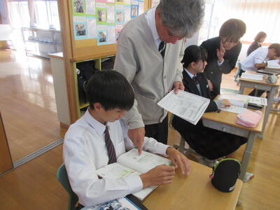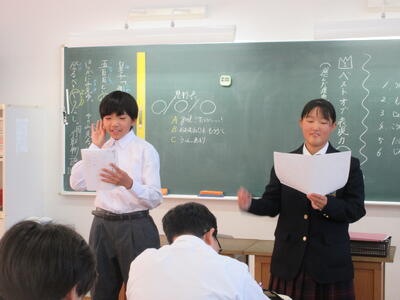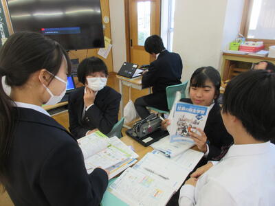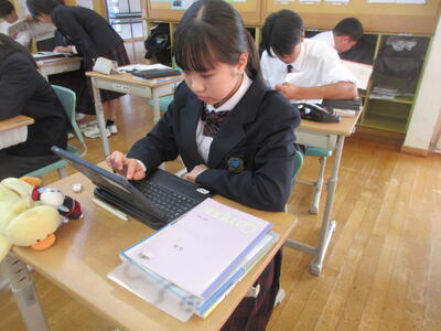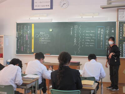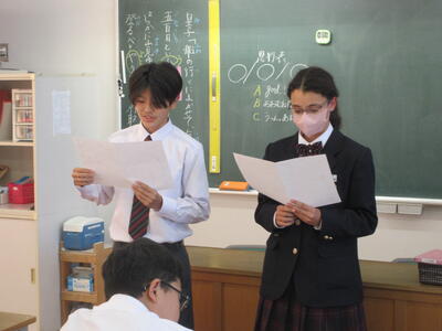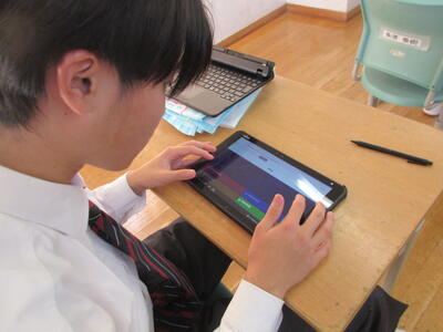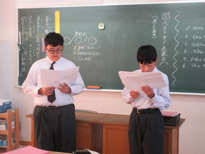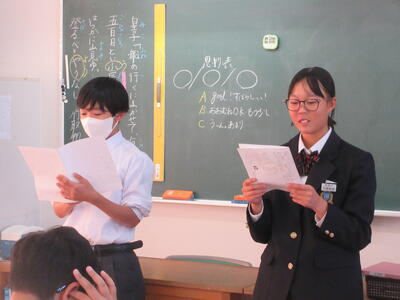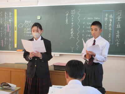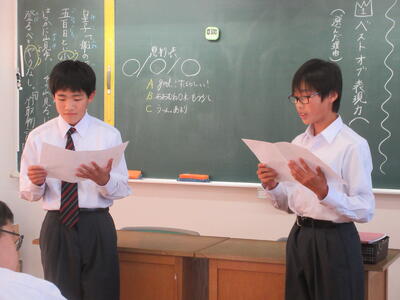 6時間目の3年生は社会。各自で学んだことの振り返り。ワークを解く生徒もいれば、タブレットで学習内容の理解度をチェックする生徒もおり、自分のペースで学びました。1年生は国語。草野心平の詩「河童と蛙」をペアで発表。リズミカルで身体が自然と動き出す詩。みんなでそれぞれのペアの「河童と蛙」の魅力を味わいました。