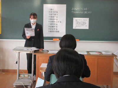 さて、今日の6時間目は避難訓練。津宮地区防災訓練の一環として、市役所、津宮地区自治会の方もいらっしゃり、地震を想定した避難経路の確認、建物の安全確認も行いました。今回は雨天のため体育館に避難。校舎の安全等の確認をしている間、生徒の皆さんは交通安全、特に青色切符について〇✕ゲームをとおして理解を深めました。来年4月1日から自転車の交通違反に交通反則制度が導入されます。それに備え、安全担当から説明があり安全な自転車運転について全校で確認しました。