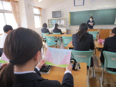 ところで、香取市の姉妹都市であるサイパン市の中学校と本校1,2年生が今年度末3月にオンラインで交流することになりました。サイパンとの国際交流は3年前、一昨年に引き続き3回目となります。そこで、今日の午後から教育委員会の方と本校職員で打ち合わせを行いました。詳しいことがわかりましたら、またお知らせいたします。英語の授業で学んだことが国際交流の中で生かせることを期待しています。