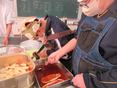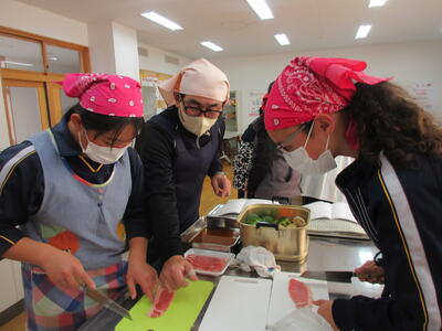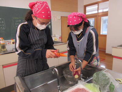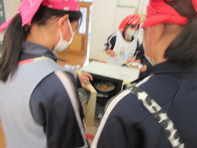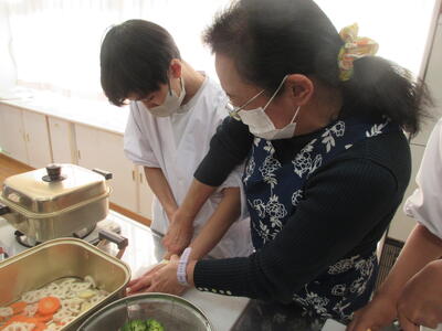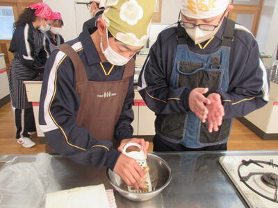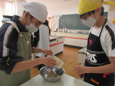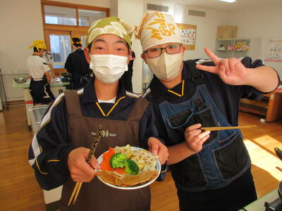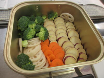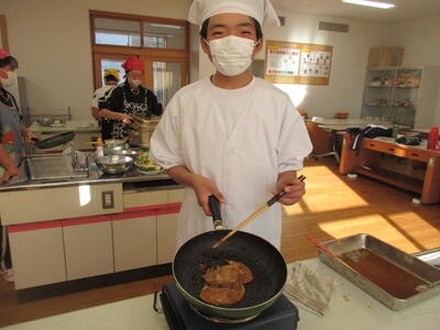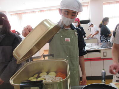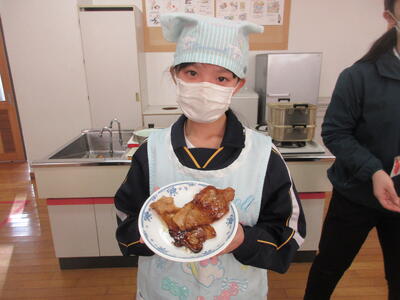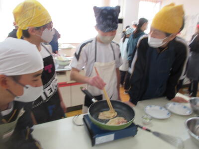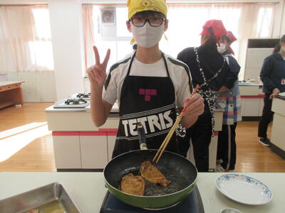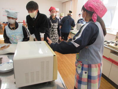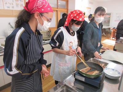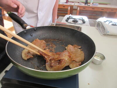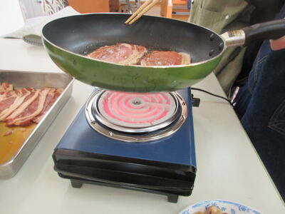 この電熱器を利用しようとひらめいたのはすごい! 家庭科室では、電熱器を使ってフライパンで豚ロースの生姜焼きを調理。お肉が焼けるいい音といい匂いが家庭科室を充満。蒸し野菜も電子レンジをフル活用しながら調理完了。1年生のみなさんはおいしくいただきました。きっと今回の調理実習のことは忘れないことでしょう。