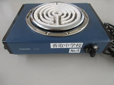 実は香取中では総合的な学習の時間(香取学習2)で雅楽を香取神宮で学んでいます。その際に使っている器具を調理器具として利用したのです。それは雅楽の笙(しょう)を温める『電熱器』でした。今はなかなか見ることはない『電熱器』ですが、もともと料理用に使われる器具を笙を温めるのに本校では使っていました。
