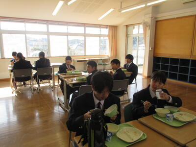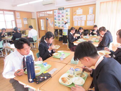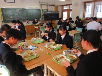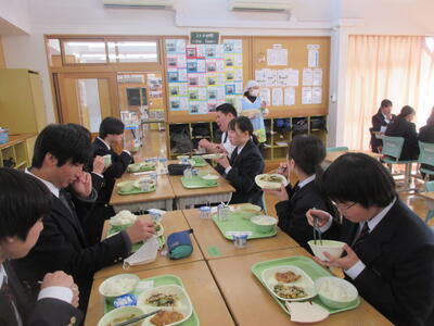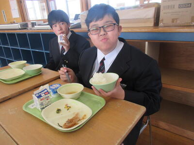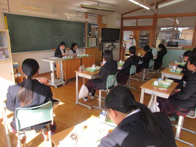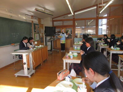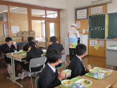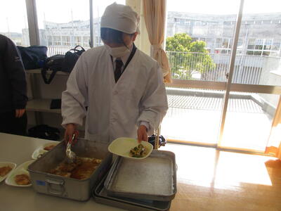今週は全国学校給食週間。本校では1月26日(月)に栄養教諭の先生が給食の時間に説明。給食センターで実際に使っている「しゃもじ」と「ひしゃく」も見せていただきました。その大きさに生徒のみなさんはみな驚き。給食センターではみなさんの栄養面、食べやすさ、食育の観点など多岐にわたって考えられた献立が時間をかけ考えられています。そして、調理にあたっては衛生面等で細心の注意を払い、集中力と体力と協力でつくられ、愛情たっぷり入った給食を毎回わたしたちは、おはし(スプーン)を使っていただいています。