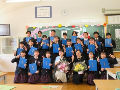 3月7日(土)みなさんお元気ですか。今日は香取中の22回目の卒業式。天候が危ぶまれましたが、朝には晴れ間が広がり、穏やかな春の陽気の中、卒業式を迎えることができました。20名の卒業生に卒業証書をお渡し、心あたたまるお祝いの言葉を香取市教育委員会教育次長さま、PTA会長様からいただきました。お礼申し上げます。送別の言葉では3年生からのバトンをしっかりと引き継ぐ思いを述べ、卒業生の言葉では感極まりながらも3年間の思いを感謝の気持ちともに発表し、涙ぐむ卒業生を多くいました。別れの歌『流れゆく雲を見つめて』『さよなら友よ』、卒業の歌『友 旅立ちの時』では体育館いっぱい素敵なハーモニーが響き渡りました。ご臨席いただきました来賓の皆様からたくさんのお褒めの言葉をいただきました。感謝申し上げます。