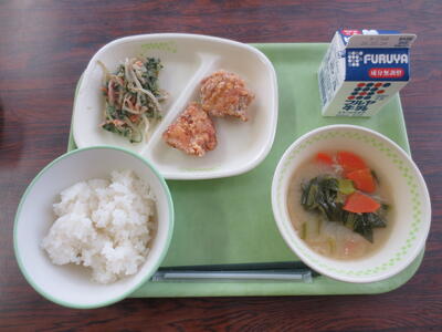 今日の給食は鶏のから揚げにごはん、さつま汁にマヨおひたし、牛乳。今日も彩りよく栄養価の高い献立、おいしくいただきました。