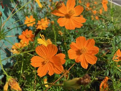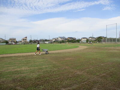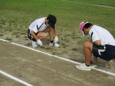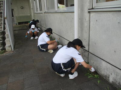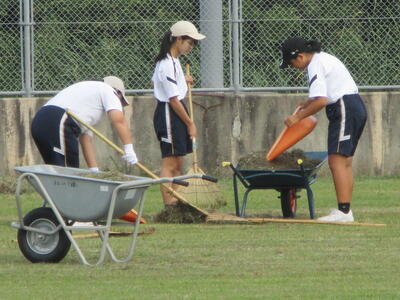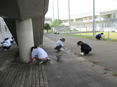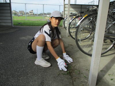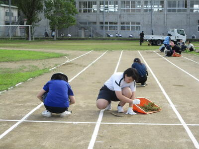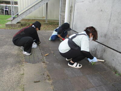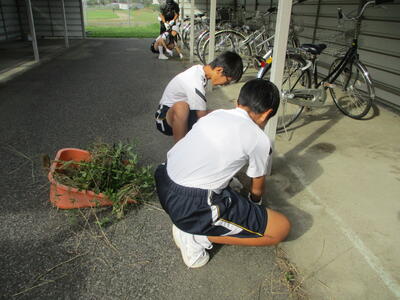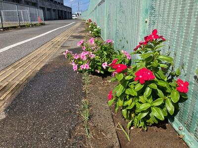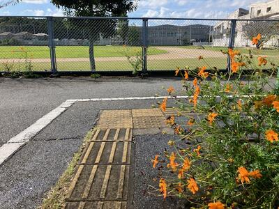 9月22日(月)体育祭に向けて6時間目に全校で愛校作業を実施しました。保護者のみなさまにもご協力をいただきましてありがとうございました。かまでグラウンド内や花壇の草を刈ったり、タイルの目地の部分に生えている雑草を取り除いたり、刈り払い機をお持ちの保護者の方には普段なかなか除草できない校庭周辺を刈っていただくなど、あっという間に校庭、グラウンドがきれいになりました。草を一輪車やリヤカーで運んでくれた生徒のみなさんもお疲れさまでした。気持ちよい教育環境の中で体育祭はもちろん学校生活を送ることができます。生徒、保護者、職員のみなさん、ありがとうございました。駐車場にはキバナコスモスやニチニチソウが元気に咲き誇っています。