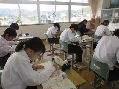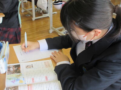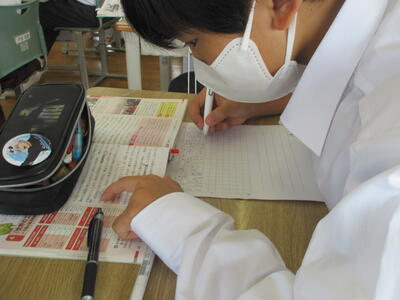 さて、今日は金曜日。朝の時間はかとらぼノートの日。今日の教科は社会。1年生は、2年生は、3年生は。3年生のみなさんはまさに今の実社会と直結している内容ですね。今回も書き写した教科書の文章をさらにしっかり理解するために、助詞の穴埋め問題にチャレンジ。今回の各学年が視写した文章の穴埋め問題は以下のとおりです。