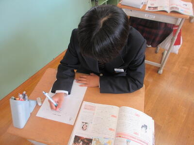 3時間目の2年生は道徳。国の天然記念物になっている「鳥取砂丘」について。その景観が観光客による落書きになどによって損なわれている実態があります。美しい鳥取砂丘を守っていくために条例があっても守られていない現状をどうすればよいのか、鳥取県砂丘事務所のポスターを使って考えました。