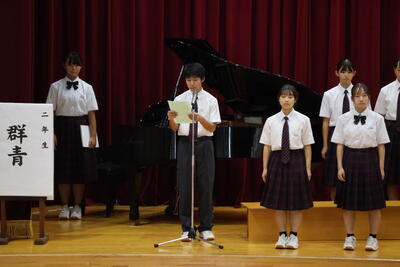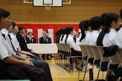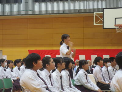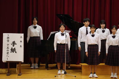 つづく第二部は合唱発表会を開催。本校の全生徒による全校合唱。体育館中にすばらしいハーモニーが響き渡りました。全校合唱の2曲目の「あなたへ」はとりわけ感動的な歌声でした。そして各学年ごとに合唱を発表。3年生の全身を使って声を会場に届けようとする気迫あふれる合唱はスタンディングオベーションでした!