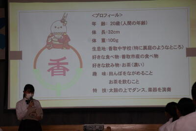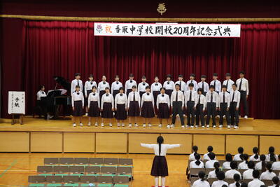 その後、第一部は香取中の20年を写真で振り返りました。笑顔あふれる20年間の卒業生のみなさん、職員のみなさま。それを引き継いで今があることを確かめられた時間。また、本校の校章を作成していただいた1期生の方からその作成経緯と生徒への応援メッセージもいただきました。そしてそのスライドには、音楽科の先生がピアノの生演奏で、しみじみしたテンポでの校歌、ふるさとで彩を添えました。一部の最後は本校3年生考案の新マスコットキャラクターも披露されました。「香鳥」かとりです!