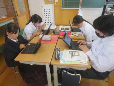 午後からは1年生は技術。かんなの使い方を動画で確認した後、実際に本たての材料にかんなをかけました。かんなをかける経験は技術の授業でなければなかなかないこと。先生の話をよく聞き真剣に取り組みました。一方、2年生はお隣の家庭科室でポケットづくり。まずは練習用布を使ってまつり縫いなどの縫い方を学びました。