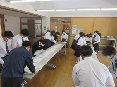 5月11日(木)朝の読書の時間を利用して、1年生はタブレットで『歯と口の健康標語』を入力しました。どんな標語ができたでしょうか。ちなみに昨年も同様に生徒の皆さんから標語を募り、学校賞を決めたり、優れたものは学校代表として郡市の標語展に出品したりしました。(保健室前には昨年度の標語が掲示されています)2年生は教育相談。読書をしながら順番に別室で担任の先生と教育相談を行いました。3年生は、来週の修学旅行に備え、「しおり」の製本。5時間目はしおりの読み合わせを行いました。行って見学だけで終わらず、自分たちでアポをとった体験活動場所でものづくりを体験したり、会津の歴史や福島の今をしっかり学んだりして、修学旅行を有意義に過ごしてくださいね。