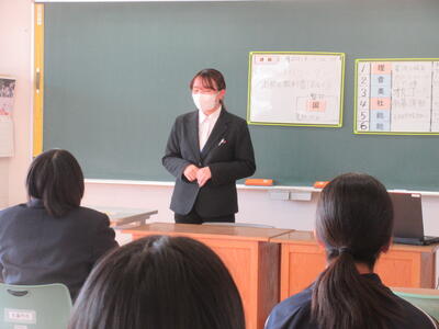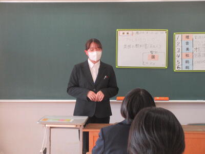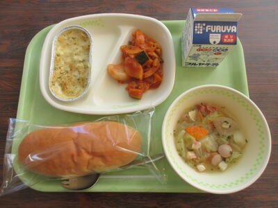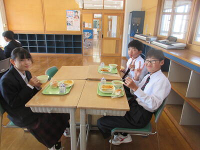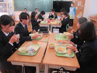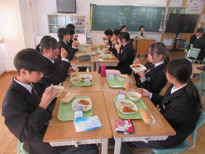 今日は月曜日程で授業は5時間まで。給食は地産地消献立「千葉を味わおう」第2弾。メニューは香取のマッシュルーム入りグラタンに千葉ポトフ、根菜のラタトゥイユ、米粉パンに牛乳。マッシュルームは香取市が誇る生産量日本一の食材。千葉ポトフは千葉県産食材の旨味を引き出し身体の中から温めてくれるスープ。このレシピは香取中の香取学習2で2年前の食と健康コースの生徒が開発したもの。また、かぶやかぼちゃ、れんこんが入った根菜のラタトゥイユは食感も楽しめました。今日もおいしくいただきました! そして2年生では教育実習が2週目に入っています。帰りの会では2年生にお話しをする実習生。実習も折り返しを迎えます。ぜひすてきな実習を本校で終えられたらと願っています。