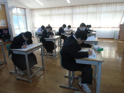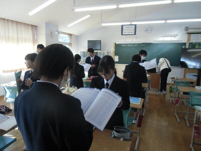11月10日(月)みなさんお元気ですか。登校時は雲に覆われていましたが、日中は秋空が広がりました。今日から1,2年生は第2回定期テスト。今日の1,2時間目は英語に理科。学びの成果を発揮すべく頑張って取り組みました。3年生の2時間目は英語。授業冒頭はタイムトライアル。不規則動詞の過去形、過去分詞形をペアで確認しました。