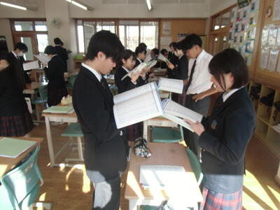 6時間目の1年生は英語。オーストラリアの美しいサンゴ礁の一帯、グレートバリアリーフにあるハート形の島の特徴を読み取りました。2年生は国語。徒然草からちょっと残念な人々として、6つの章段を読み比べをしました。3年生は理科。化学変化とイオンの単元からダニエル電池の原理についてグループごとに考えました。