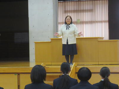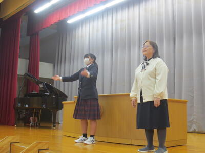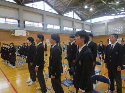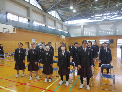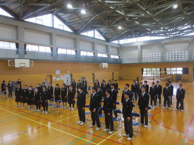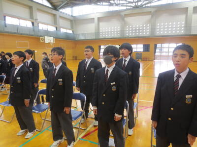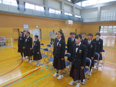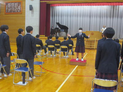 また、午後6時間目は第1回式練習。まずは3年代表から式練習を始めるにあたってメッセージがあり、その後、3年生代表4名がステージ上で手本となり、礼の仕方を中心に全校で式の流れを確認しました。