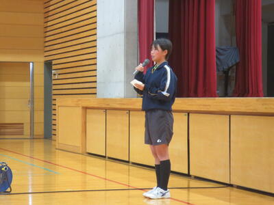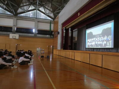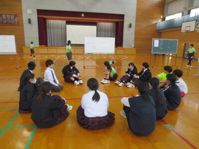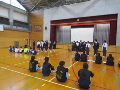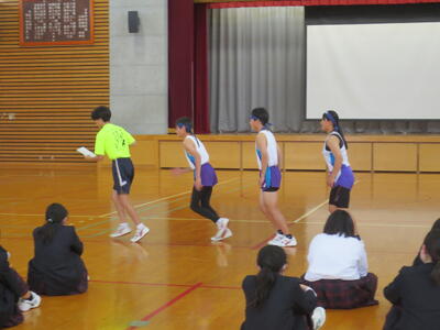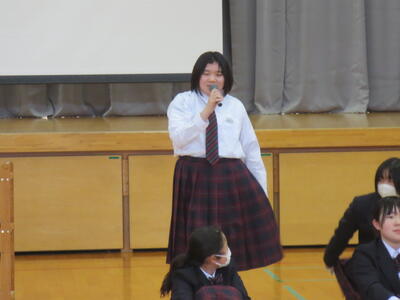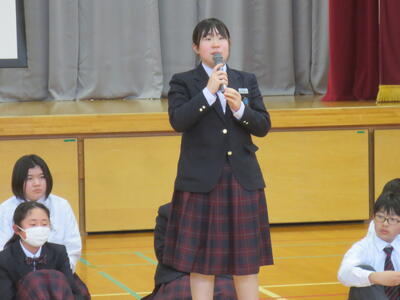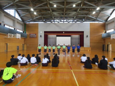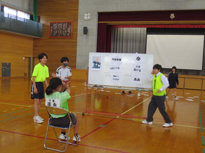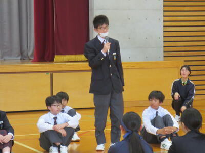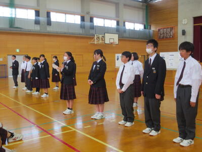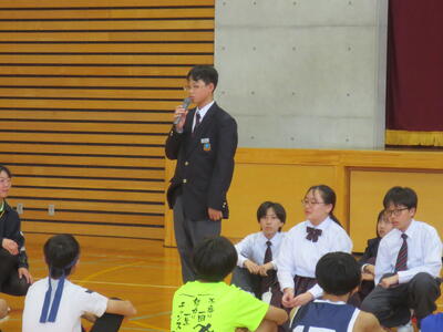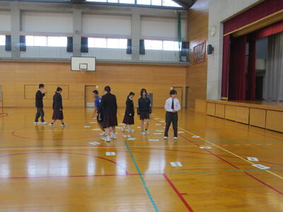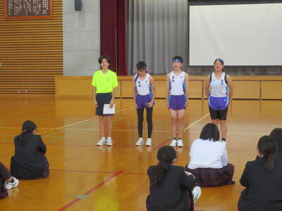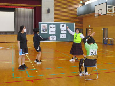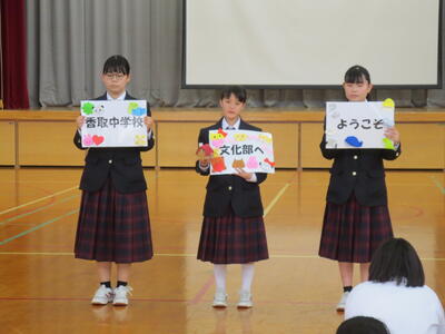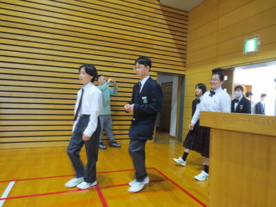 4月14日(火)みなさんお元気ですか。今日は午後から生徒会主催で「新入生歓迎会」が開催されました。まずは生徒会本部役員からスライドを使って学校行事の紹介。続いて、各委員会の委員長から委員会の説明。その後、明日から行われる香取神宮の式年神幸祭について、地域の伝統行事を知ろうクイズが行われました。2,3年生はもちろん、新入生のみなさんも3月に香取神宮の方からお話を聞く機会があったので今回のクイズはおさらい。明日の全校見学に備えました。その後、休憩をはさんで部活動紹介。趣向を凝らした発表で、1年生はどの部活動に入ろうか悩んでしまったかもしれません。今日から始まる部活動見学や体験入部等をとおして、じっくり考え決めていってほしいと思います。その後、全校レクをとおして親睦を深めました。3人の先生方の誕生日や好きな漢字、好きな色、隠し芸、趣味などさまざま項目をフロアに置かれた選択肢カードを使ってチーム毎に回答して行きます。最後はどのチームも該当の先生の好きな漢字だけが正解にならず、競り合う中で優勝チームが決まりました。1年生のみなさんはきっとレクをとおして、2,3年生とたくさんおしゃべりができたのではないでしょうか。最後に1年生からお礼の言葉が代表生徒から述べられ、新入生歓迎会が終わりました。