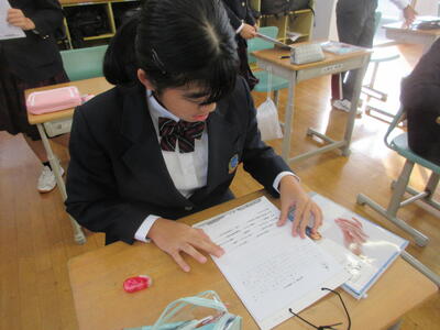 4時間目の3年英は家庭科。手で縫い、ミシンをかけパペットを作っています。完成したパペットはクリーナーとして活用できたり、パペット芝居として演じたりもできます。ショートストーリーをつくって発表予定です。