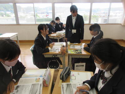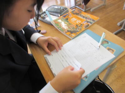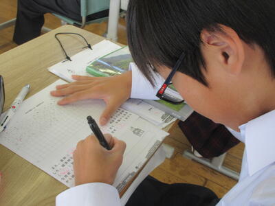 3時間目の2年生は道徳。国の天然記念物になっている「鳥取砂丘」について。その景観が観光客による落書きになどによって損なわれている実態があります。美しい鳥取砂丘を守っていくために条例があっても守られていない現状をどうすればよいのか、鳥取県砂丘事務所のポスターを使って考えました。