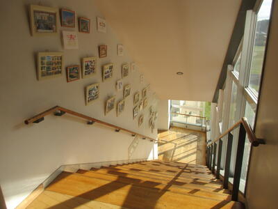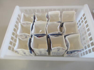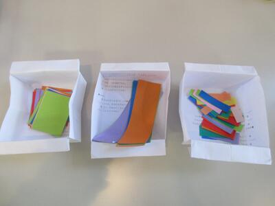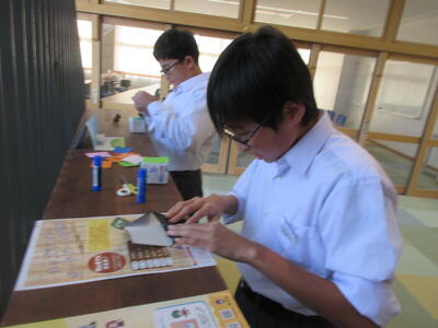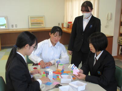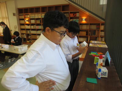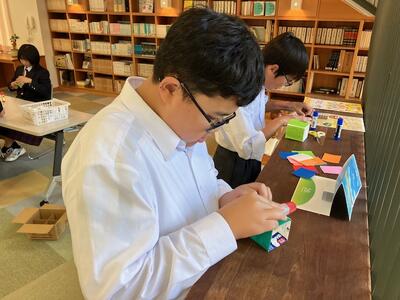 10月28日(火)のお昼休みに、図書室1階閲覧スペースでアートワークショップ第3弾を行いました。今回は牛乳パックを折り紙でデコレーション。1,2年生昇降口の階段が殺風景なため、生徒のみなさんの手作り作品で飾られたらと思いワークショップを開催。牛乳パックの側面を好きな色の折り紙で貼付け、その後は参加した生徒のみなさんの感性に委ねた飾りをつけて完成します。明日も引き続きお昼休みに開催予定です。