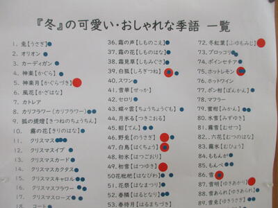 2年生の教室廊下側掲示版には、秋や冬を表す季語がたくさんリストアップされています。そのリストから推しの季語にはシールが貼られています。「秋のかわいい季語」では『三日月』や『林檎(りんご)』、冬のかっこいい季語では、『時雨(しぐれ)』や『神楽(かぐら)』『冬銀河』、『荒神祓(こうじんばらい)』、冬のかわいい・おしゃれな季語では『白狐(しろぎつね)』や『ホットレモン』、『雪菜』が多くの票を集めています。