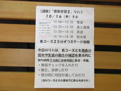 10月16日(木)みなさんお元気ですか。ここ数日、朝は秋らしい陽気が続いていますね。今日の香取中は来週の合唱発表会、香取学習成果発表会に向けて午後から準備。香取学習2の各コースが本番さながらにステージやアリーナを使って発表練習を行いました。当日ではなかなか撮れないアングルでの画像を紹介します。保護者のみなさま、ぜひご来場いただき子ども達の活躍をご覧ください。