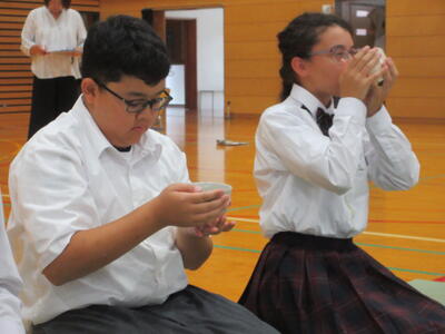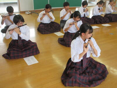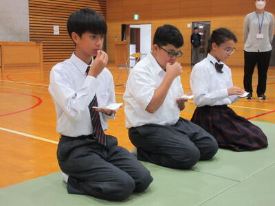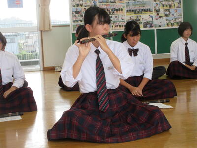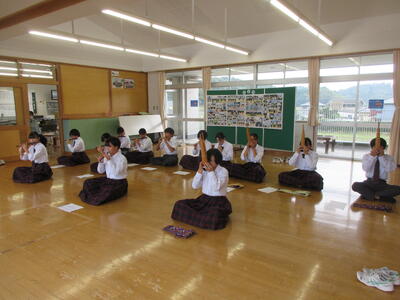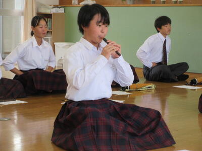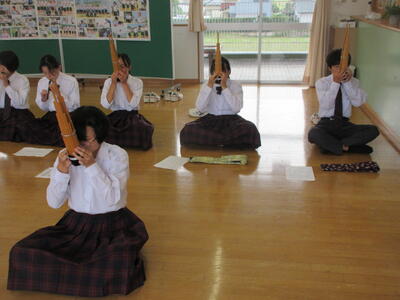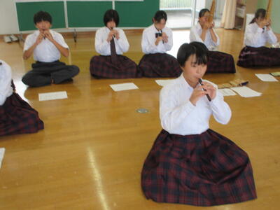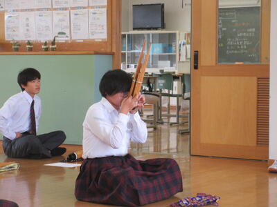 10月9日(木)午後からは香取学習2の日。雅楽コースのみなさんは今日が香取神宮の方から直接ご指導いただく最終日。そして、拝殿で奉納演奏をさせていただく日。各管(龍笛、篳篥、笙)で練習した後、唱歌(声に出して歌う)、その後、合わせ練習。そしていよいよ奉納演奏のため、社務所から拝殿へ移動。保護者の皆様にもお越しいただき演奏を聴いていただきました。6月から10回あまりご指導いただいた成果を披露する場。厳かな中、香取中生が演奏する「越殿楽」が香取の杜に響き渡りました。演奏後は、ご指導いただいた先生方と記念写真を撮り、社務所に戻り、各管ごとに感謝の気持ちを伝えました。香取神宮様には今年度もご指導いただきましてありがとうございました。日本古来から伝わる雅楽を学ぶ機会を得ることができましたこと、お礼申し上げます。