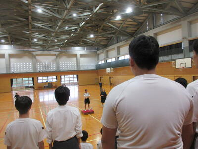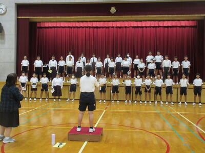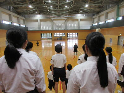 さて、今日の香取中。未来の香取中生が訪問してくれました。水の郷小さんが本校の体育館を利用して体力測定のシャトルランを行いました。1組目は1年生と6年生。その後、2年生と5年生、3年生と4年生が順々に訪れ午前中をかけて測定を行いました。津宮小と大倉小が統合した際に、中学校と連携して同じ体操服、ジャージに水の郷小の児童のみなさんはなりました。中学生と同じ体操服姿を見ると、なんとも微笑ましく、俵万智さんの短歌『未来のサイズ』を思い出しました。
