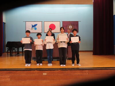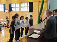 児童会長1名(6年生)、児童会副会長2名(6年生、5年生)、書記2名(5年生)が任命書を授与されました。