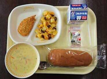 ・コッペパン ・ままかりトマトクリームフライ ・コーンポタージュ ・パンプキンポテトサラダ ・牛乳