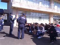 いざ始まってみると、子どもたちは正しく行動できていました。身を低くして頭を守る、窓ガラスや棚から離れる、などの一時避難がしっかりとできました。その後は放送の指示でグラウンドへ。これも「おかしもち」の約束を守ってできました。