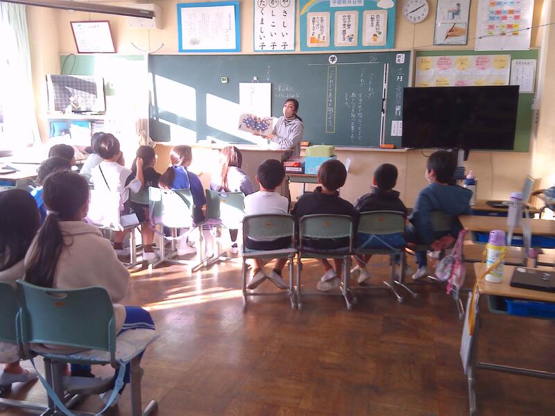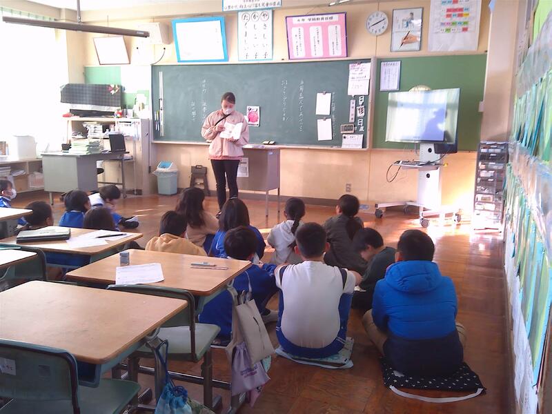 今日も前には担任ではない先生が立ちます。ちょっと緊張感があります。先生が本のことを語り始めると、よくお話を聞き、反応しています。こうして読み聞かせが始まります。