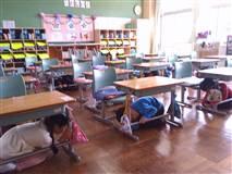 校内放送で避難訓練開始。まず一次避難として、机の下に入り身を守ります。その後、防災頭巾を被り校庭へ二次避難をします。「おさない・かけない・しゃべらない・もどらない・ちかづかない」の「おかしもち」を守って、命を守る訓練を行いました。1年生から6年生まで、約束を守って適切な行動が取れました。