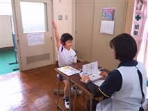 測定の仕方は、昔とほとんど変わりませんが、体重計は今はデジタルが主流です。視力は完全にアナログで、アルファベットの「C」の形をしたランドルト環を教師が向きを変えて示します。見えたら徐々に小さくなっていきます。ただし今は、「視力1.5」という記録ではなくAからDまでの記録表記をします。聴力検査は、ヘッドホンをあてて、聞こえたら手を挙げたり(ボタンを押したり)します。1年生も保育園でやっていたこともあり、手際よくできていました。