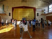 本日、3年生の体育の授業ではグラウンドでサーキットトレーニングを行った後、体育館に移動して、体ほぐし運動(新聞紙にグループで乗る)を行いました。どうやったら上手に小さい新聞紙に乗れるか、よく相談して協力して考えました。どのグループも成功したら笑顔で大喜びしていました。
