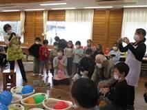 その後は、一緒にゲームです。2年生とお年寄りの年の差は、70歳くらいはあります。どちらも一緒に楽しめるゲームって?・・・施設の職員の方のアイデアに感心しました。写真のように、かごに入った風船を投げたお手玉で外に出す、というものです。たくさん出したチームの勝ちとなります。ゲーム中は自然に応援の声が上がります。子どももお年寄りも区別はありません。みんなで楽しむことができました。
